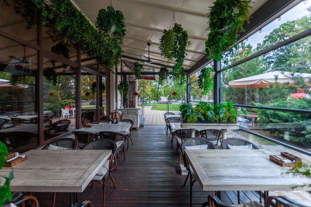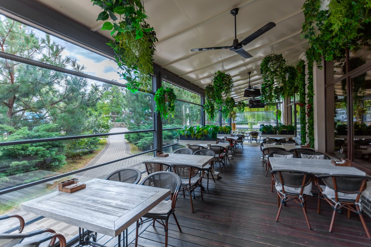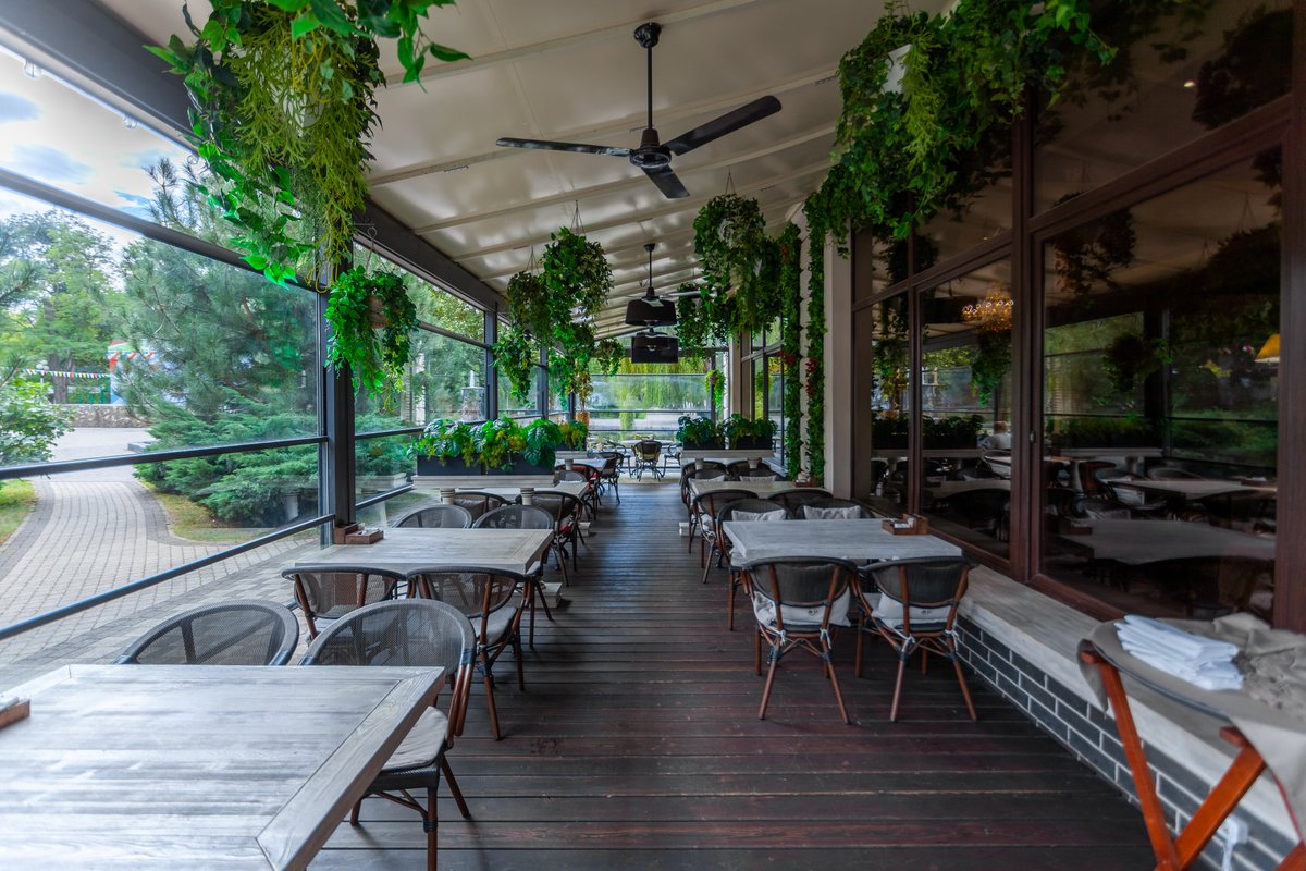 Наш ресторан расположен на крыше! Он славится не только своей кухней и напитками - мы берём интерьером внутри и вокруг. Если вы цените красоту вокруг, посетите наш ресторан. Если за окном стоит тёплая погода, лучше чаще находиться не в помещениях, а на улице. И не только гулять, но и пообедать или поужинать. Для этого у ресторана ГорPark имеется веранда с выходом на улицу.